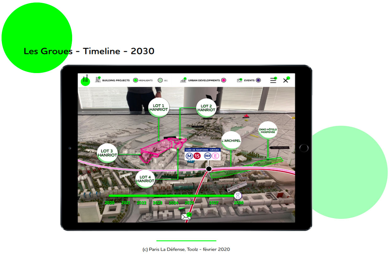Pour animer la maquette physique d'un projet d'aménagement avec des fonctionnalités interactives, les solutions de réalité augmentée sont désormais accessibles par une simple application mobile. Qu'il s'agisse de présenter des points d'intérêts, des médias, des flux, des programmes ou des phasages, une rapide reconnaissance de la forme de la maquette détectée par une tablette ou un téléphone, met en mouvement des compléments essentiels de compréhension.